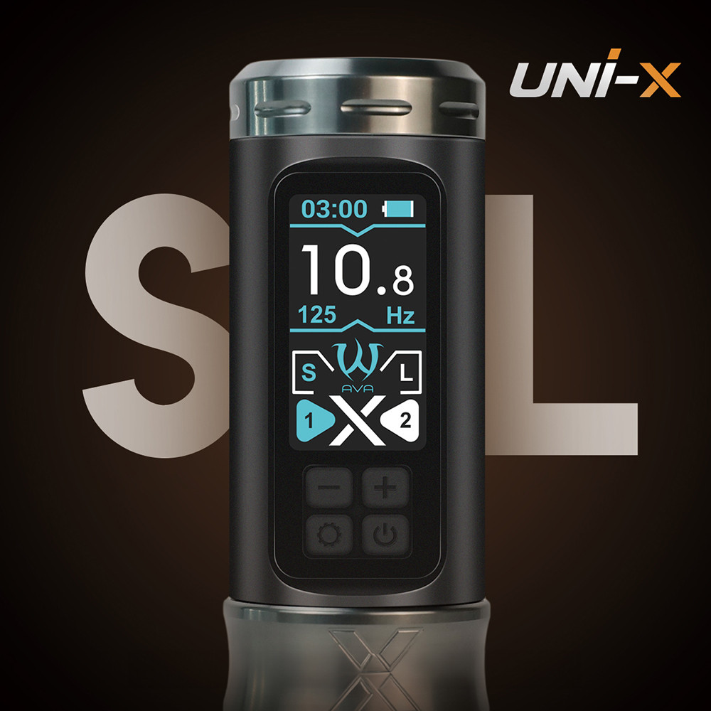 Az AVA UNI-X vezeték nélküli tetováló gép a modern technológia és az elegáns funkcionalitás tökéletes egyensúlyát hozza el a stúdióba. Minden részletében a tetoválóművészek igényeire hangolva készült: megbízható teljesítmény, hosszú távú kényelem és felhasználóbarát testreszabhatóság jellemzi. A repülőgép-alumíniumból készült ház könnyű, mégis rendkívül strapabíró, a kefe nélküli AVA motor pedig akár 10 500 fordulat/perc sebességgel gondoskodik a folyamatos, egyenletes működésről.