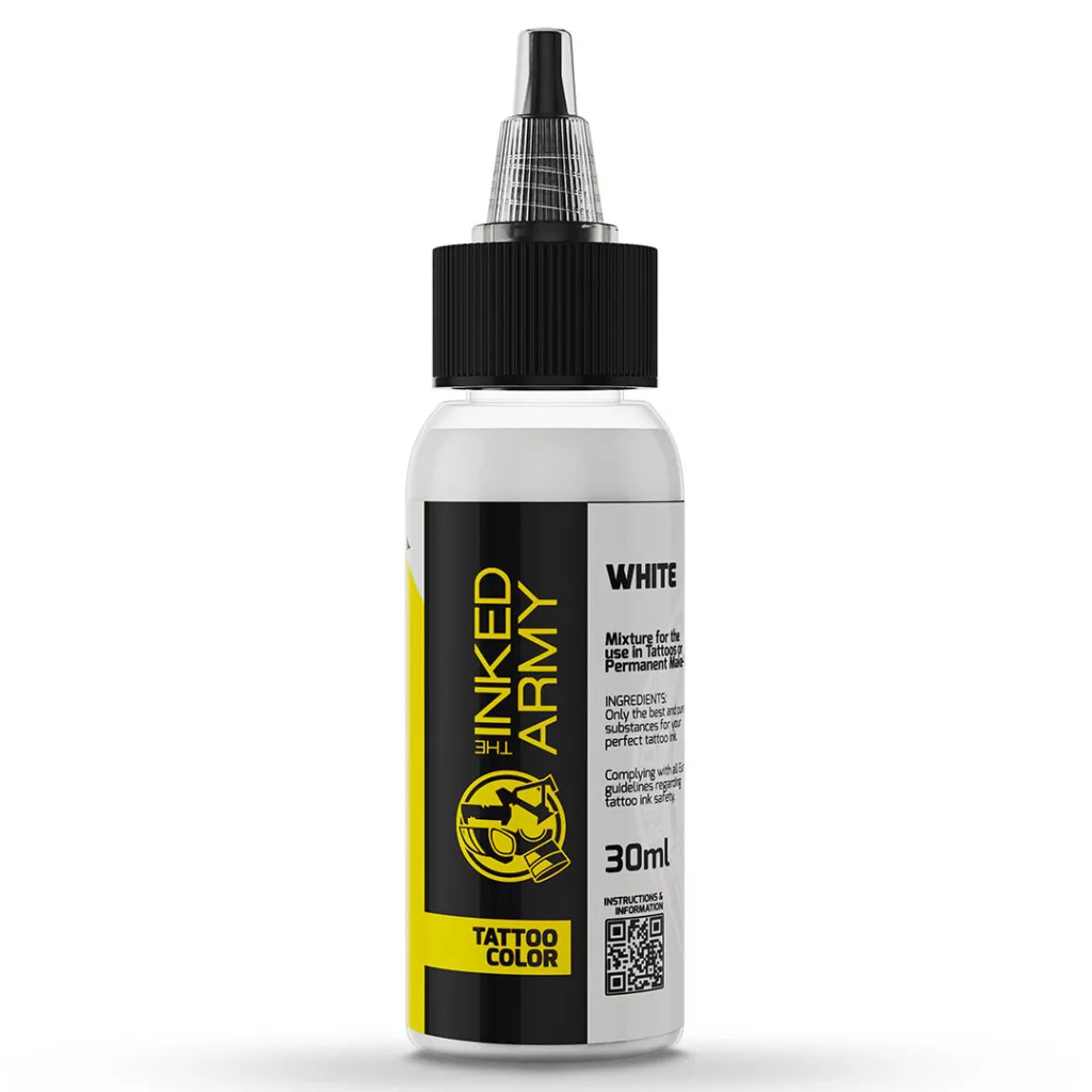 A THE INKED ARMY – Tattoo Color – White (30 ml) egy élénk, tiszta fehér tetováló festék, amelyet kiemelésekhez, keveréshez és tónusok finom világosításához fejlesztettek ki. Highlights-hoz határozott, „crisp” eredményt ad, keverésnél pedig segít tisztán világosítani a színeket anélkül, hogy „koszosítaná” a tónust. Ez különösen akkor előnyös, amikor a végső fényeknek és apró részleteknek kell megadni azt a pluszt, amitől a munka rendezett és kontrasztos marad.